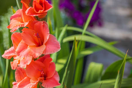 Beautiful close up view of orange gladiolus flowers on blurred green leaves and purple flowers on background.