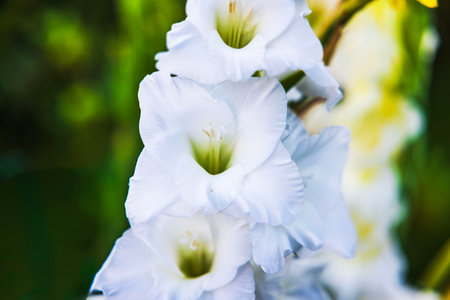 Close up view of delicate white gladiolus flowers blooming in garden. Sweden.