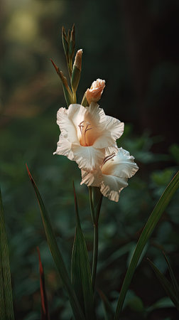 a blooming gladiolus in the mountains of guangxi, showcasing its white and fluffy petals against a bright background. this macro photograph captures the vivid and realistic details of the flower, with a large depth of field of 16k. ai generated