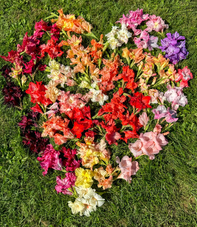 A heart made of flowers is on the grass. The flowers are of different colors and sizes. The heart is surrounded by grass and flowers, creating a beautiful and colorful scene