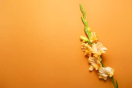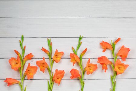 Beautiful orange Gladiolus flower on wooden background. holiday greeting card. Flat lay, Top view