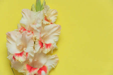 Beautiful purple pink gladioluse on yellow color paper background. Greeting card
