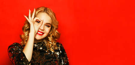 Portrait of happy beautiful young woman with bright shiny makeup. Smiling Blonde with brightly colored long hair. Pretty girl with long curly hair. Fashion model in a shiny dress posing at studio.