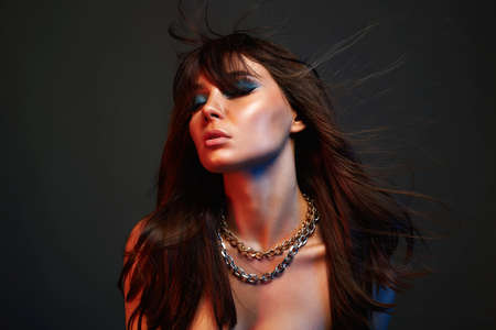 Beautiful woman with colorful Make-up in color Light. amazing girl with makeup and steel chain necklace. beauty portrait. flying hair