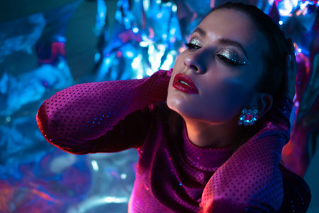 Stunning portrait of a woman with dazzling makeup and vibrant lighting in an artistic studio setting