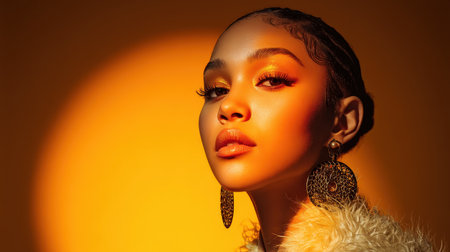 High-fashion portrait with bold lighting and makeup, black background, studio shoot quality.