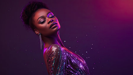 Black woman in sparkling dress against purple background.