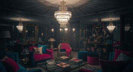 Living room decor, home interior design . Art Deco Glam style with Chandelier decorated with Velvet and Glass material . Generative AI AIG26.