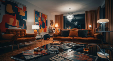 A stylish living room featuring modern furniture, abstract art on the walls, warm lighting, and a cozy atmosphere