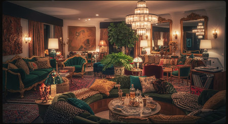 A luxurious vintage living room with ornate furniture, lush plants, and elegant decor, featuring a large chandelier and rich textiles