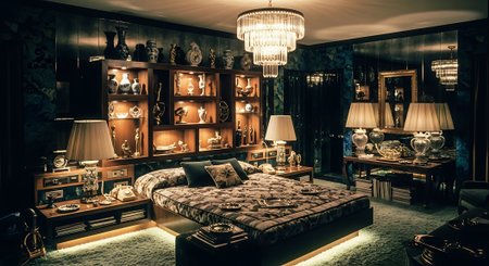 Bedroom decor, home interior design . Art Deco Glam style with Chandelier decorated with Brass and Velvet material . Generative AI AIG26.