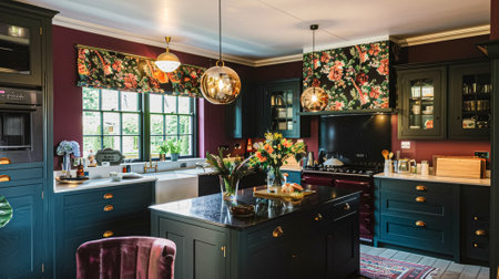 Elegant kitchen with teal cabinets and floral wallpaper backdrop