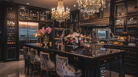This luxurious kitchen features dark cabinetry, crystal chandeliers, plush velvet bar chairs, and an exquisite floral arrangement on the island High-end appliances and a wine cabinet filled with