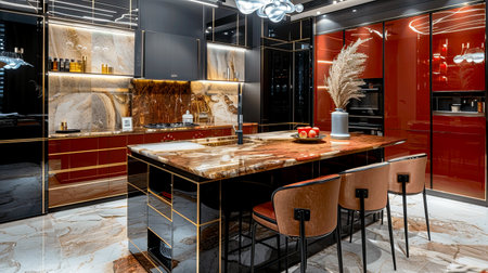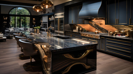 Luxury modern kitchen with black marble countertop. Gold decorations. Created with generative AI