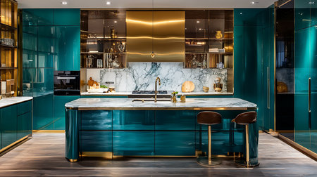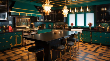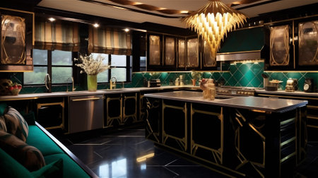 This Art Deco style kitchen is the epitome of glamour and luxury. Bold geometric patterns, metallic accents, and rich colors such as black, gold, and emerald green create a visually stunning space