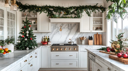 A beautifully decorated kitchen ready for festive gatherings exuding warmth and holiday spirit.