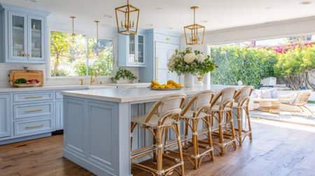An inviting kitchen features light blue cabinetry and a central island with bar stools. Natural light floods the space, illuminating the white countertops and wooden flooring. The composition highlights design elements suitable for home decor, real estate visuals, or lifestyle publications.