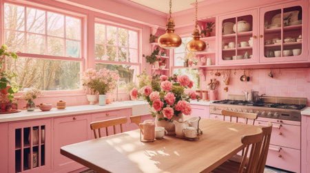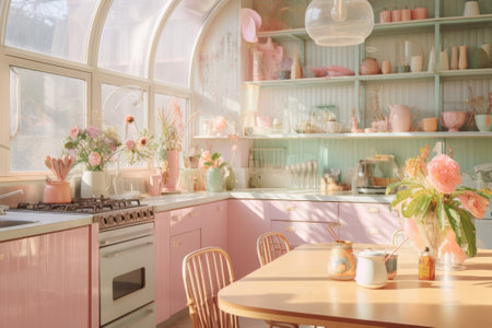 The modern interior design of aqua green tone country style kitchen with floral accent. Generative AI AIG27.