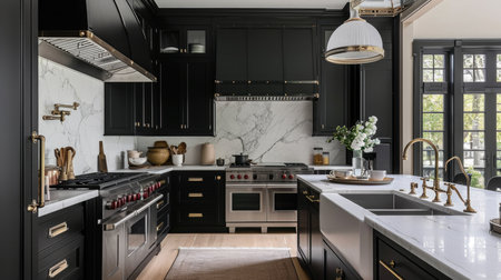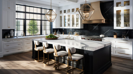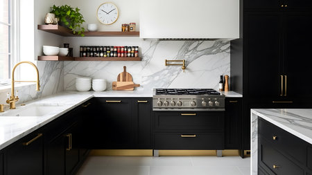 Elegant Kitchen Interior Design in Contemporary Chic Style with Black and White Marble Accents