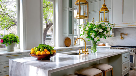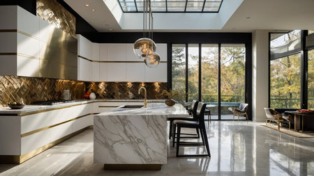 Interior design of Kitchen in Transitional style with Marble Backsplash decorated with Brass Hardware, Wood Flooring material. Modern architecture. Generative AI AIG24.