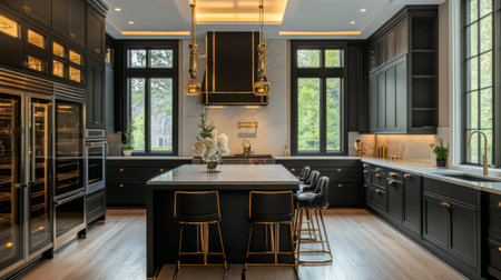 Elegant contemporary kitchen featuring dark cabinetry, marble surfaces, and gold accents, ideal for lifestyle, real estate, and interior design projects.