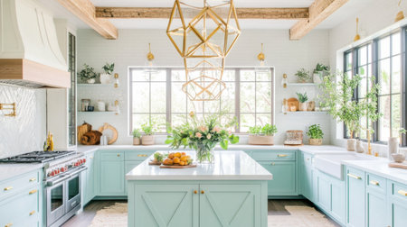 Discover a stylish kitchen featuring mint green cabinets, elegant lighting, and abundant plants that create a bright and inviting culinary space ideal for cooking and entertaining.