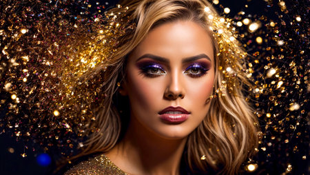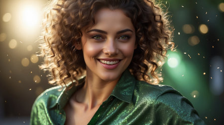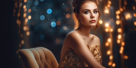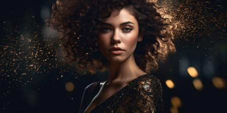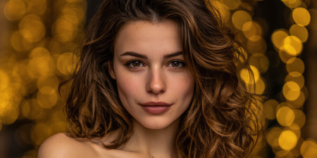 A captivating young woman poses confidently with flowing curly hair and natural makeup. Soft golden lights create a warm and inviting atmosphere around her.