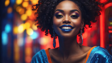 Beautiful african american woman with afro hairstyle and outlined in light. ai generative.