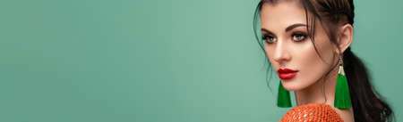Close-up portrait of a woman with short, wavy brown hair, elegant jewelry, and glowing green eyes, posing against a bokeh background. Panorama with copy space..