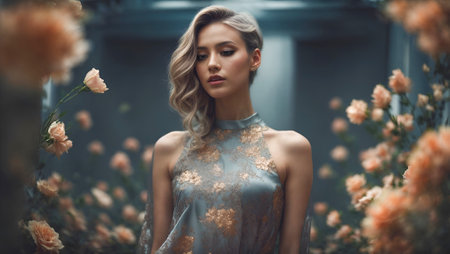 A serene young woman dressed in a green outfit adorned with delicate flower embellishments, stands out in a softly lit setting, her gaze tender, exuding an air of quiet confidence and grace.
