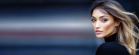 A woman stands with a serious expression showcasing her long flowing hair and striking facial features. The blurred backdrop adds a dynamic quality to her confident pose.