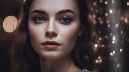 A stunning portrait of a young woman with captivating eyes, styled in a fashionable sweater. The soft glow of twinkling lights creates a warm, festive atmosphere, highlighting her beauty and elegance.