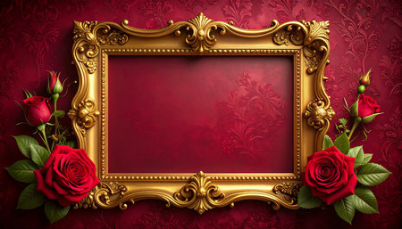 An ornate gold rectangular frame is placed on a deep red damask background with red roses.