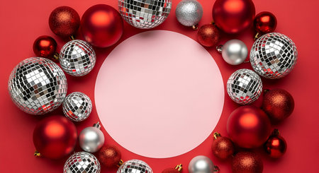 Red and silver Christmas ornaments are artfully arranged in a circular pattern on a vibrant red background. The ornaments include shiny metallic spheres, glitter-covered baubles, and small disco ball-like decorations. In the center of the arrangement is a pale pink circular space, providing a blank area for text or design elements.
