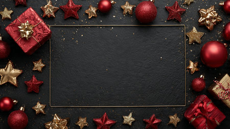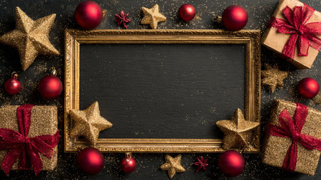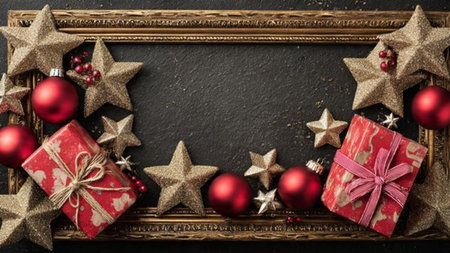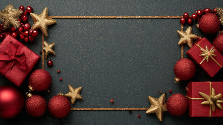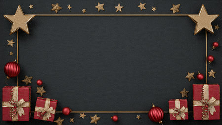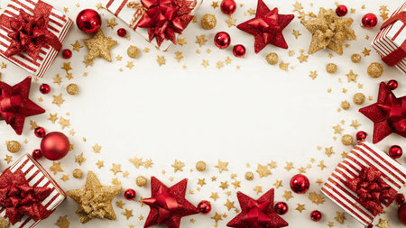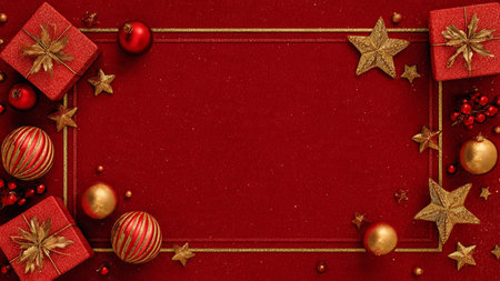 Shimmering gold stars and red decorations forming a classic Christmas border.