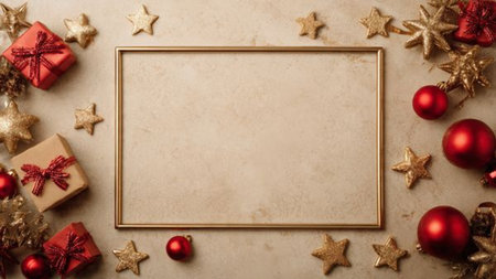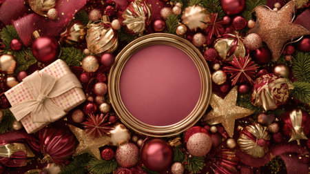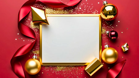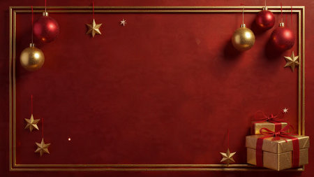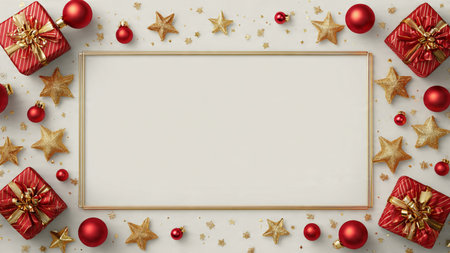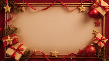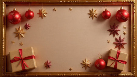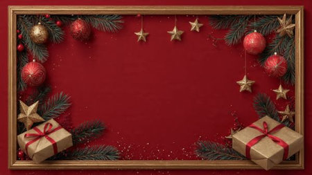 Create a joyful holiday atmosphere with this enchanting background featuring ornaments, gifts, and a blank frame ready for your festive messages.