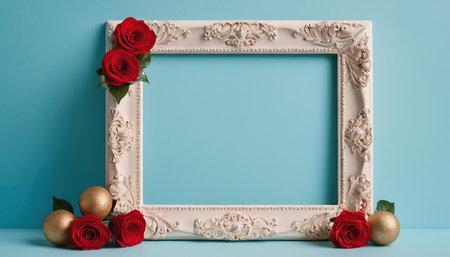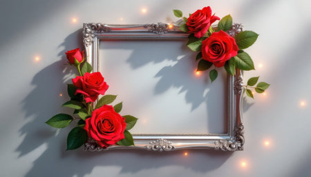 Red roses delicately frame a vintage silver frame, creating a romantic and elegant mood Perfect for wedding invitations and love declarations.