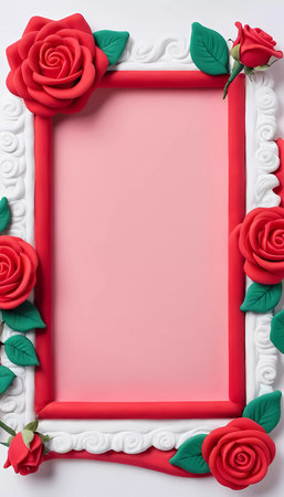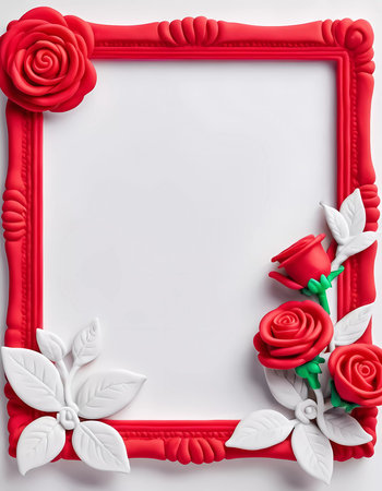 A vibrant red and white frame adorned with stunning rose decorations surrounds an empty space, perfect for personal notes or cherished memories. Generative AI.