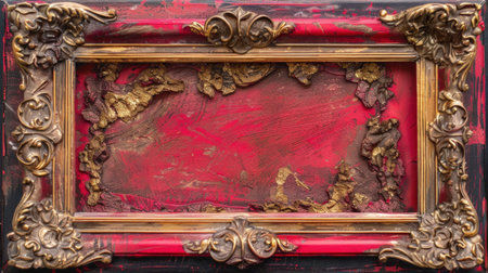 vintage ornate picture frame, red and gold, with intricate detailing and a distressed look, perfect for showcasing art or photographs Rustic background enhances the antique feel