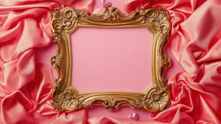 An elegant vintage golden frame surrounded by soft pink silk fabric, perfect for showcasing artwork or photographs. Ideal for romantic themes and creative presentations.