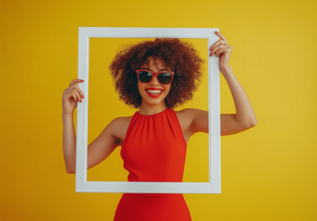 A woman in a red dress is holding a white frame in front of her face. She is smiling and wearing sunglasses. Concept of fun and playfulness