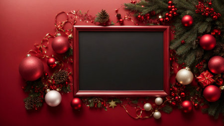 Christmas decoration with blackboard on red background. Top view with copy space