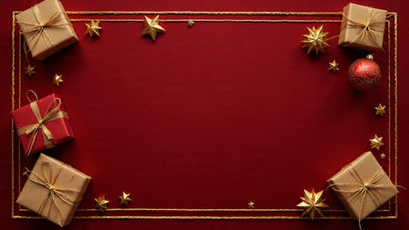 Top-view matte red layout enriched with glittery snowflakes and elegant gifts.