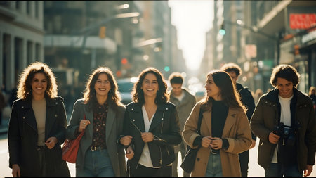 A group of young adults is seen walking down a city street, seemingly enjoying a sunny day. The image captures a joyful moment with warm tones from the setting sun. The composition likely aims to evoke feelings of friendship and togetherness, suitable for various editorial and promotional purposes.