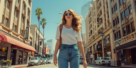 Young woman walking in Los Angeles city street California USA enjoying a holiday vacation in the United States. Concept Travel, Vacation, Los Angeles, Sightseeing, Tourism