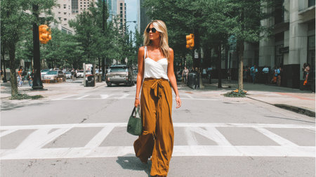 A fashionable woman strolls confidently across a sunlit city street, showcasing her trendy outfit in a vibrant urban setting filled with greenery.