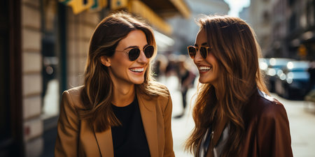 Two women walking in the city street with colorful outfit. generative AI AIG21.