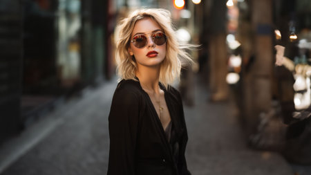 An AI generated illustration of A stylish young woman wearing sunglasses stands confidently in a sleek black robe, radiating beauty and sophistication