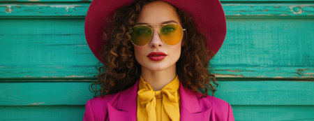 A young woman poses confidently wearing a colorful jacket and stylish sunglasses with a bold yellow wall behind.