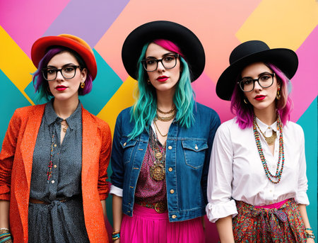 Trendy Vintage Trio: Stylish Group in Retro Fashion Posing Indoors